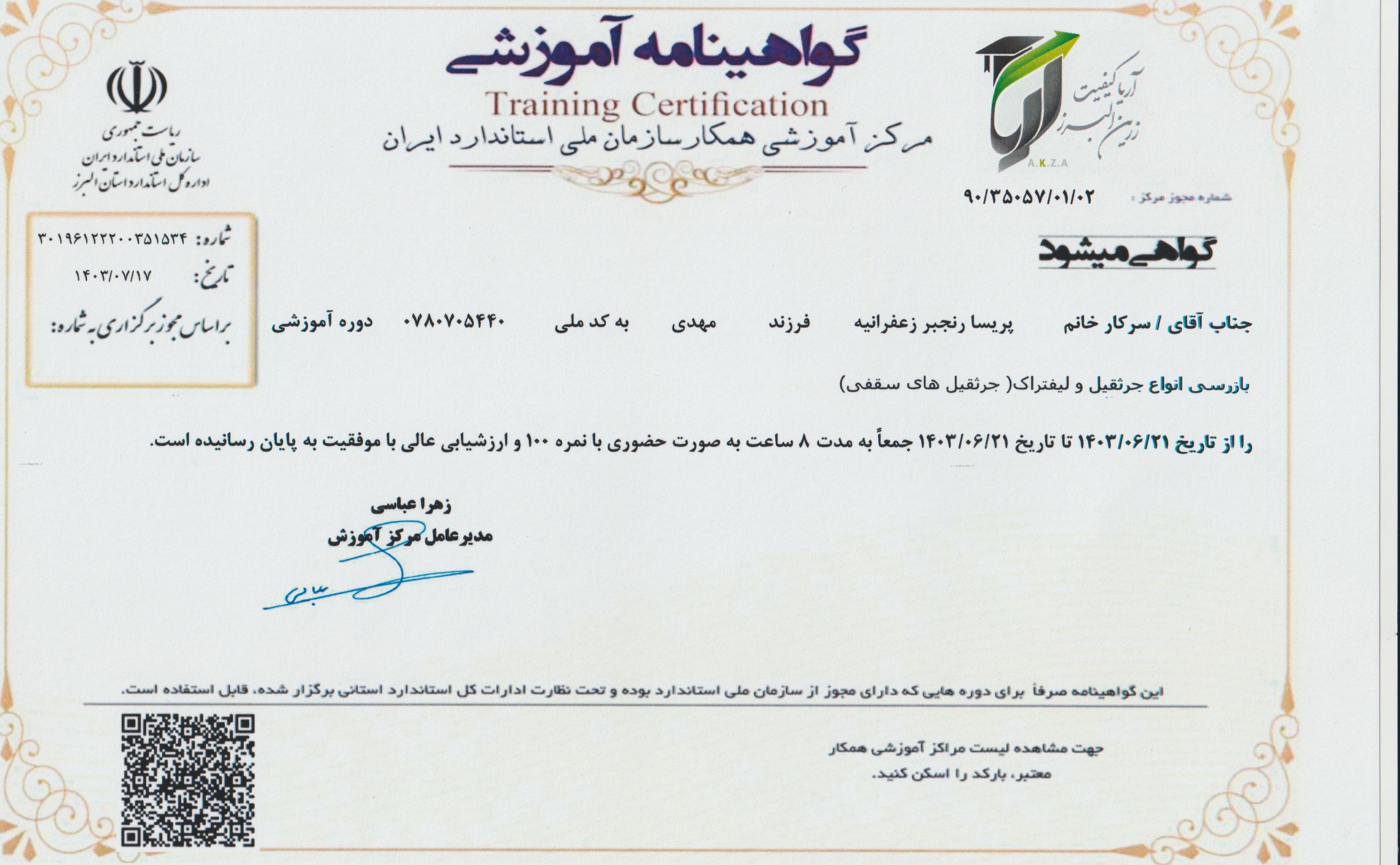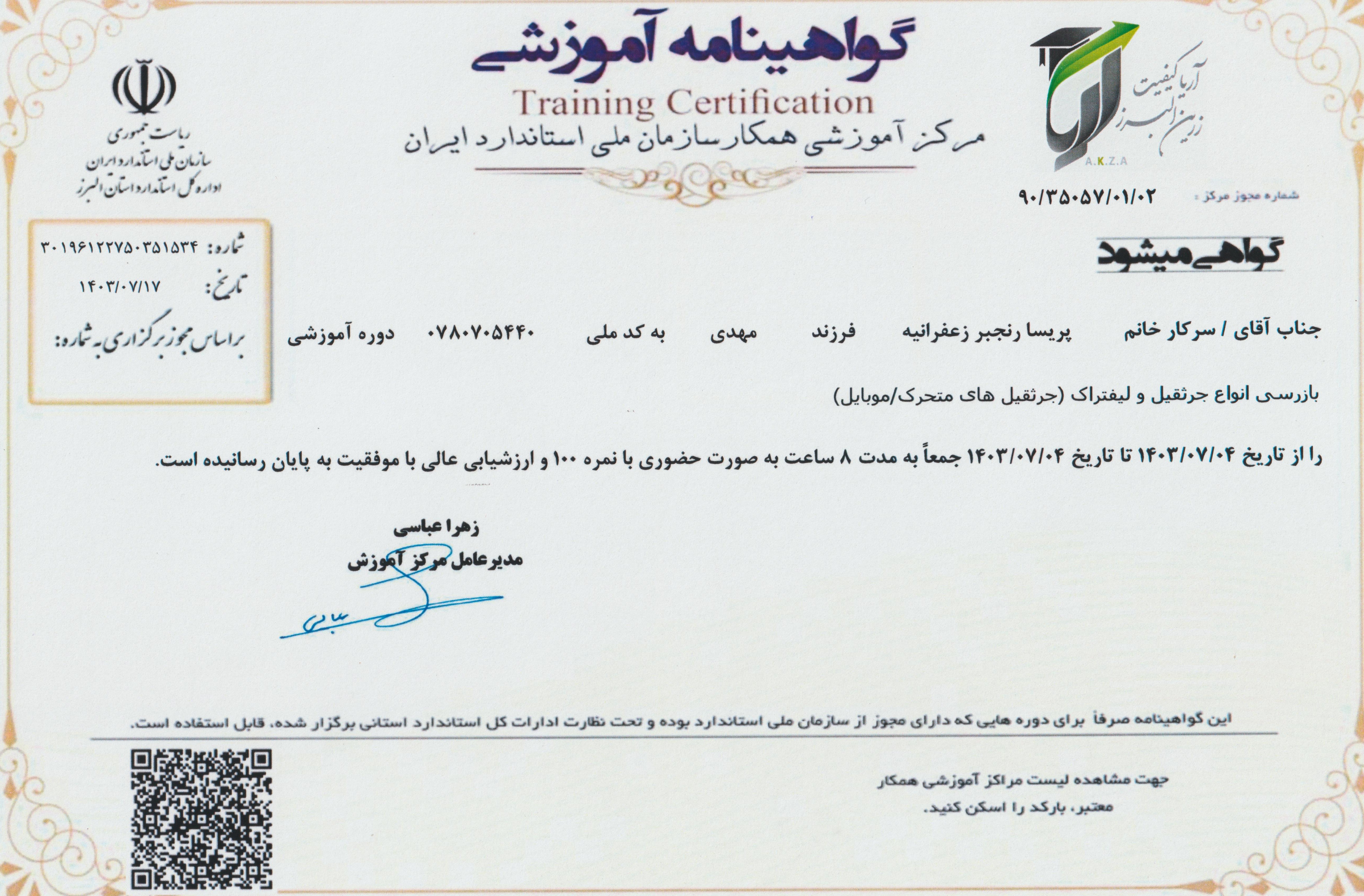 گواهینامه آموزشی جرثقیل سقفی سازمان استاندارد(پریسا رنجبر)
