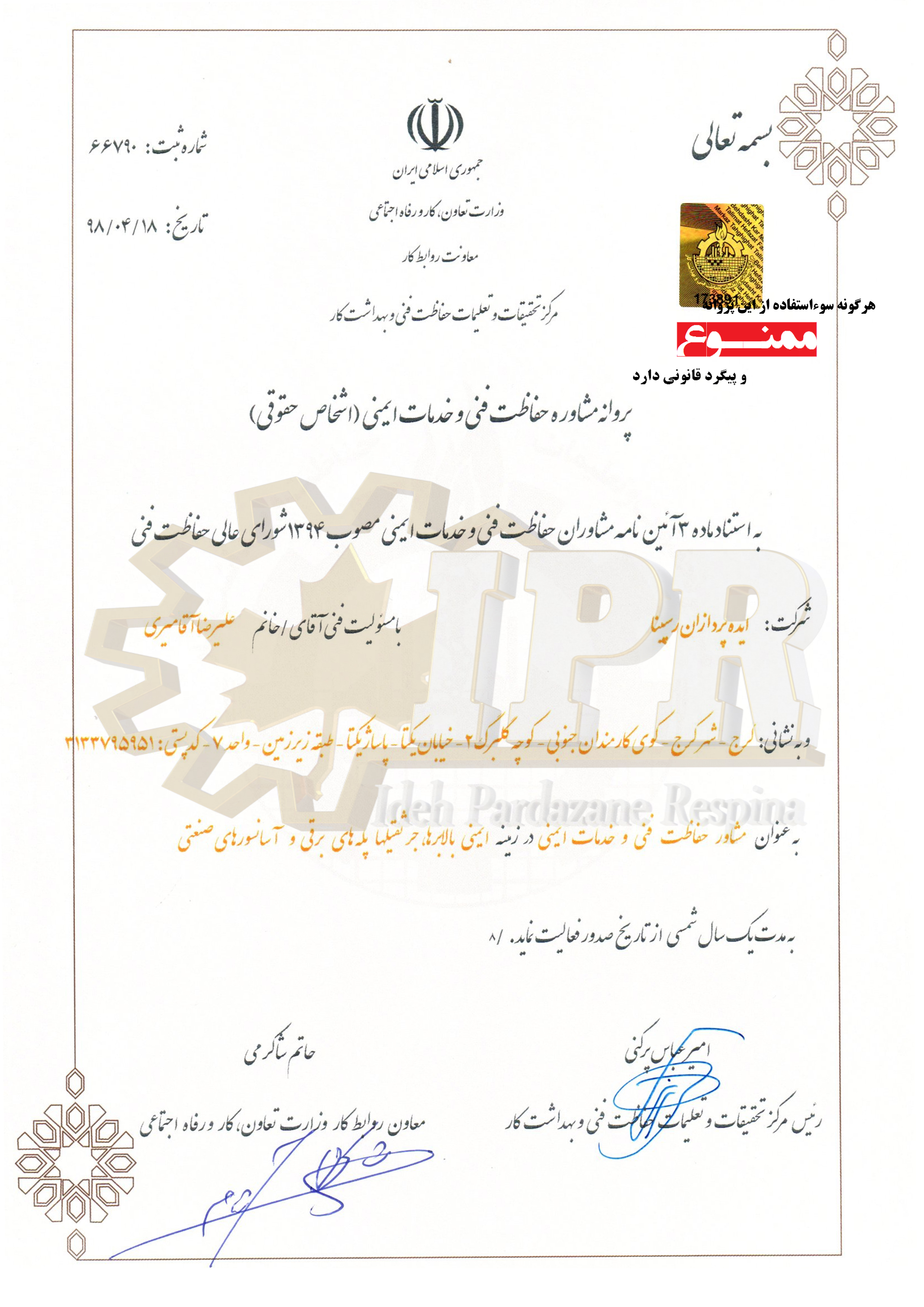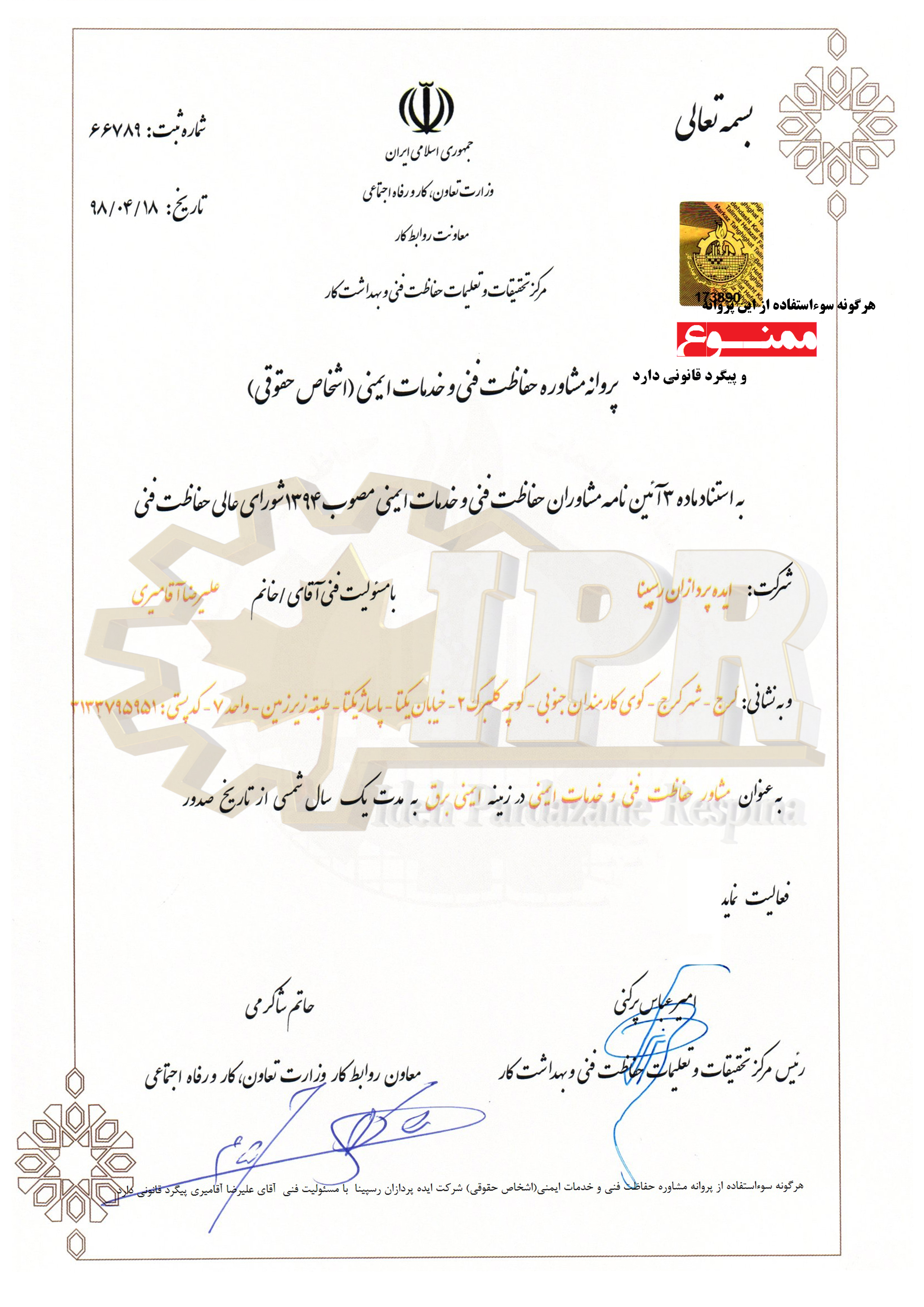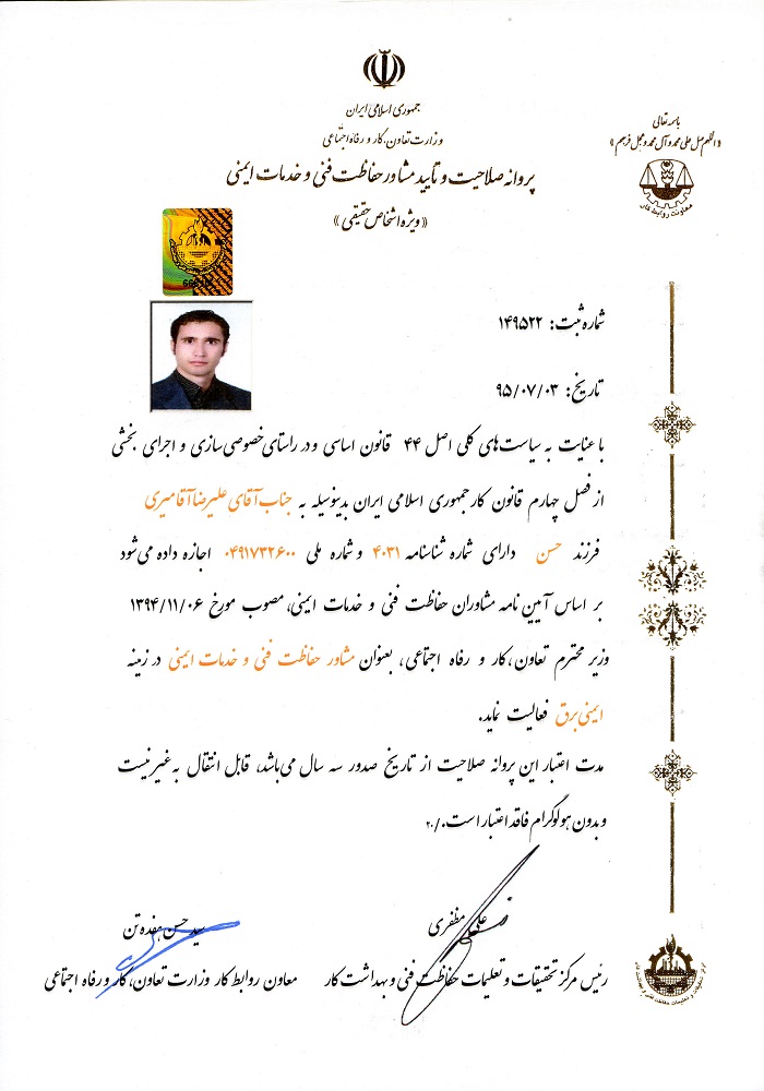 پروانه صلاحیت حقیقی ایمنی برق