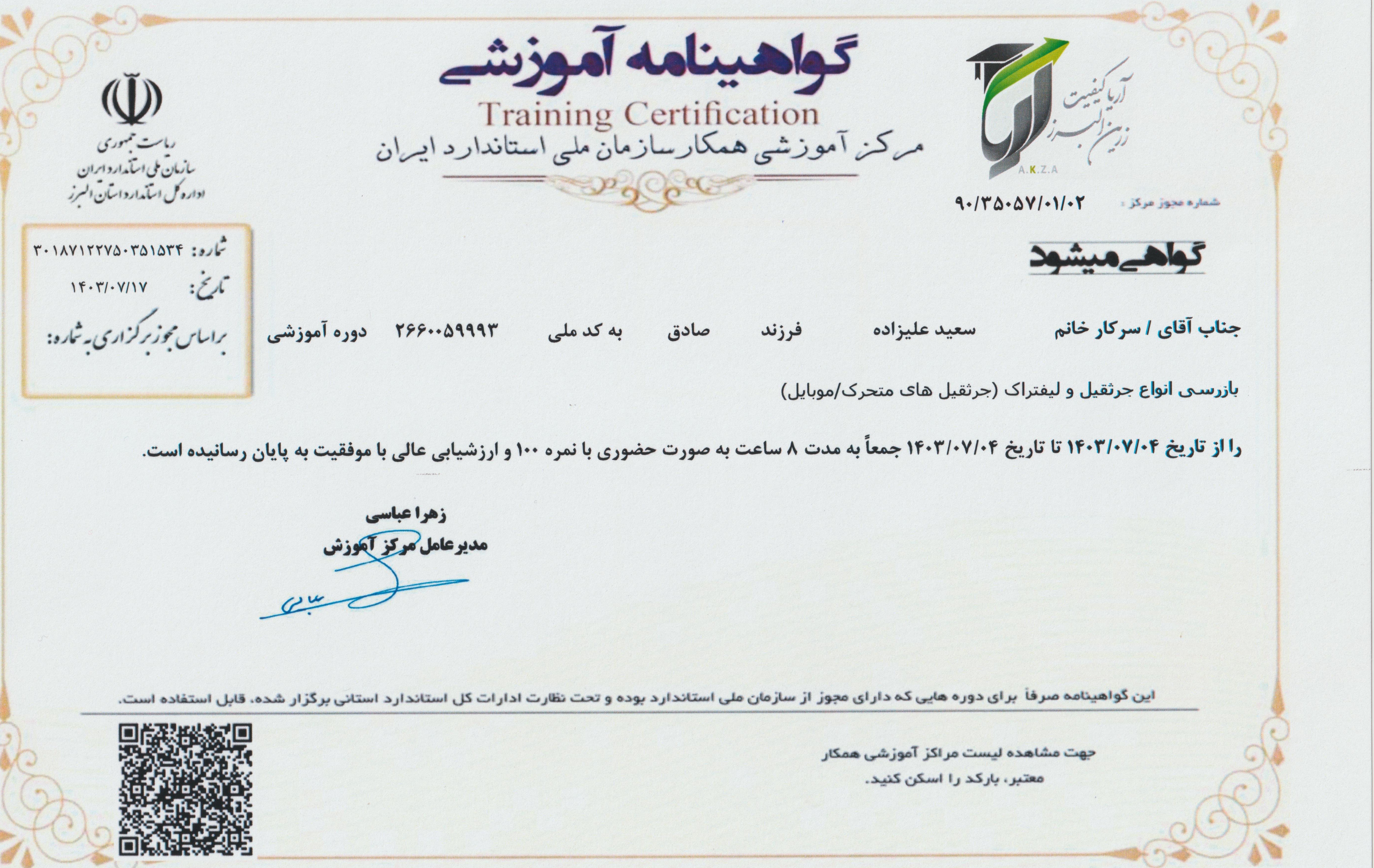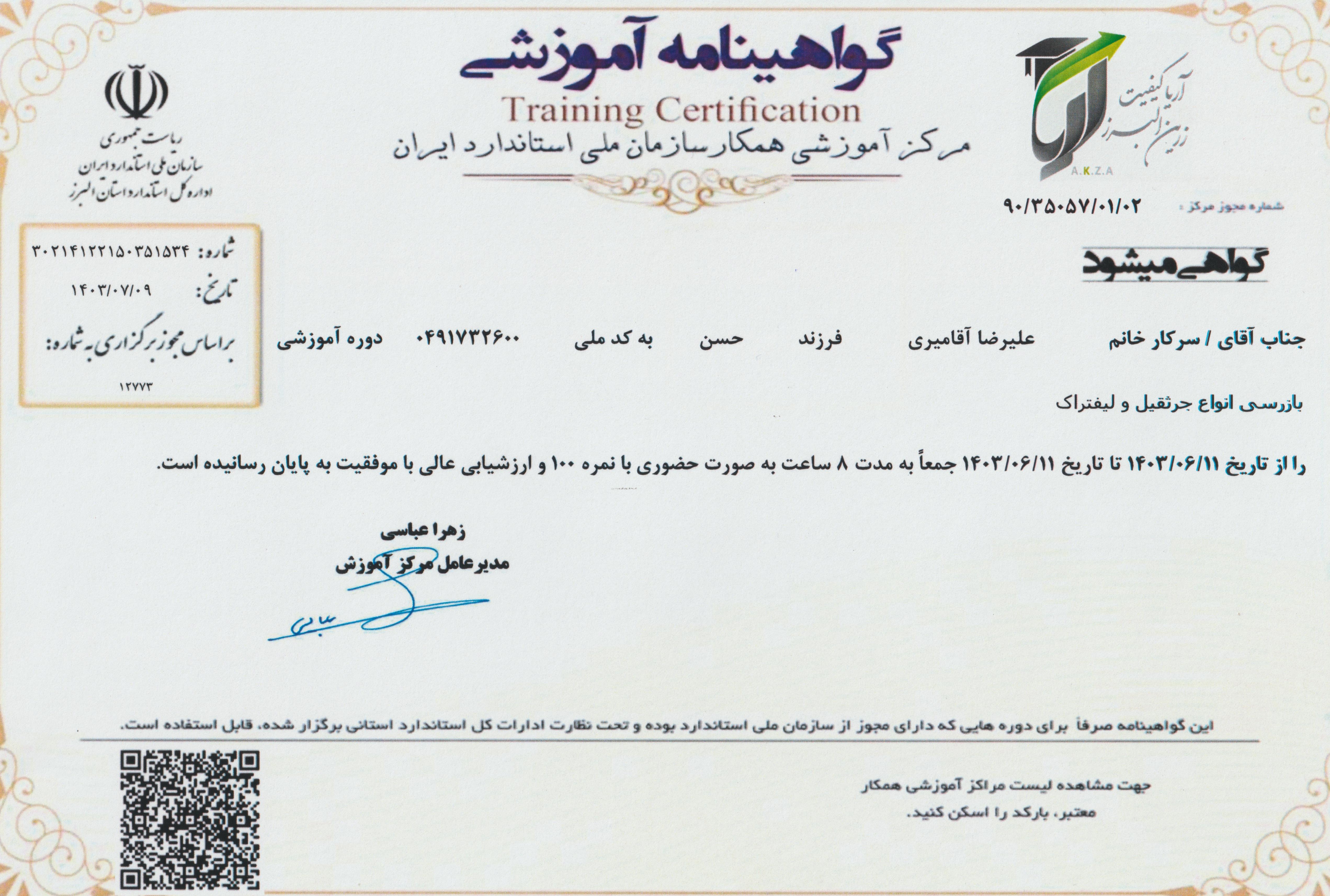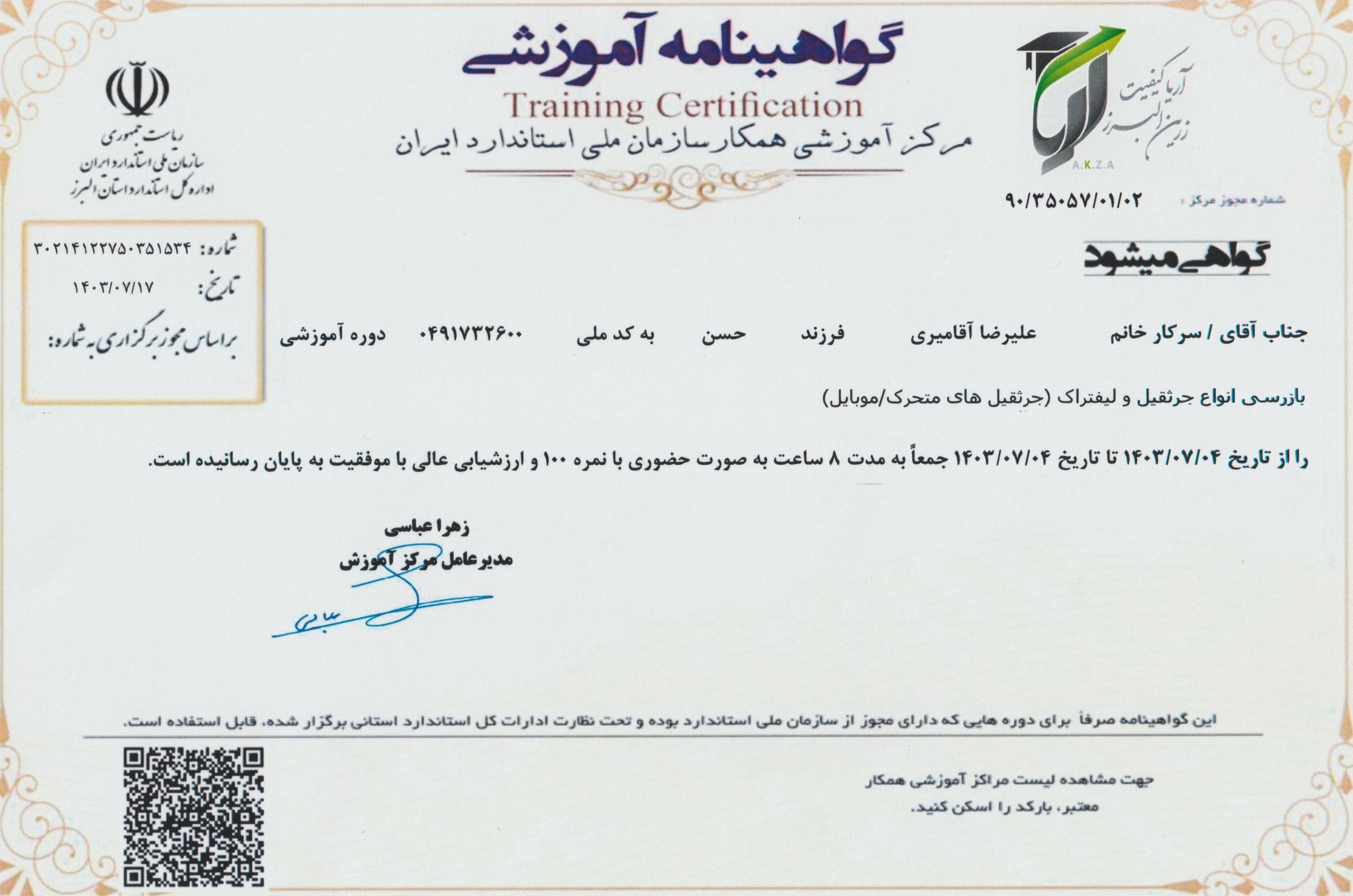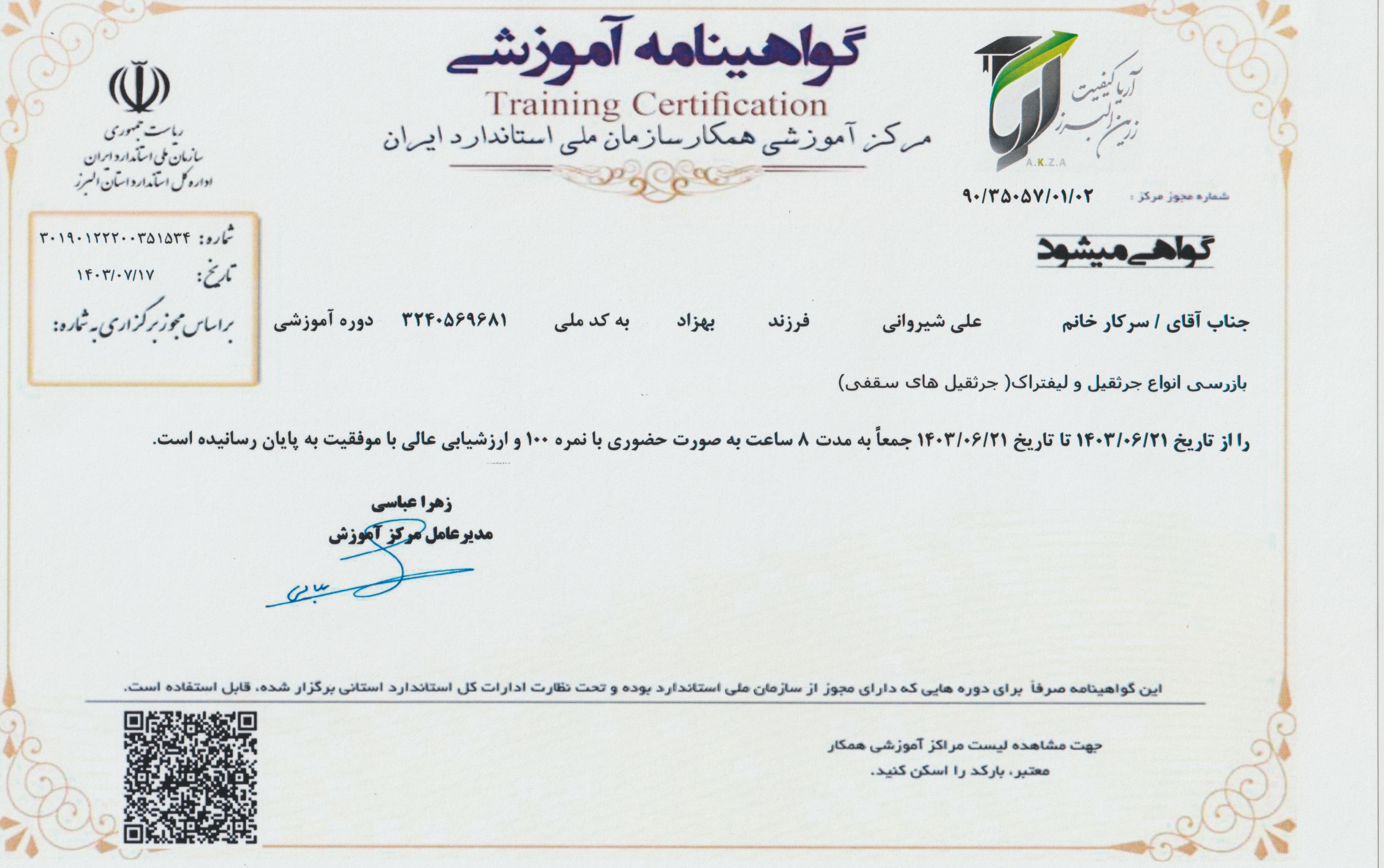 گواهینامه آموزشی جرثقیل سقفی سازمان استاندارد(علیرضاآقامیری)