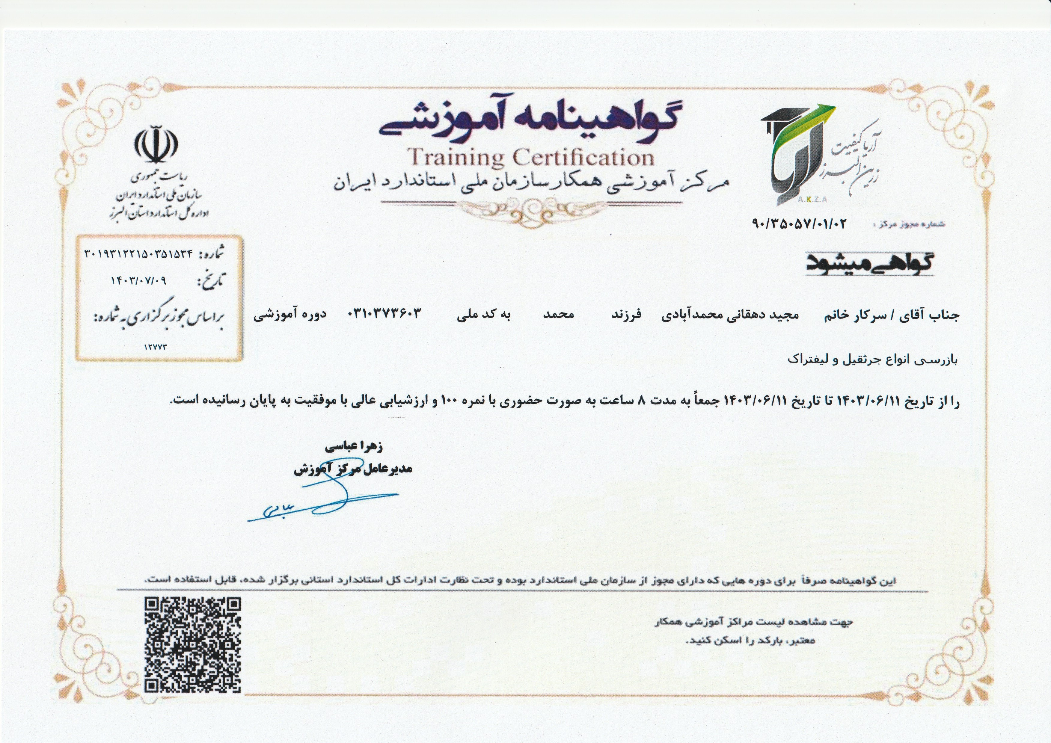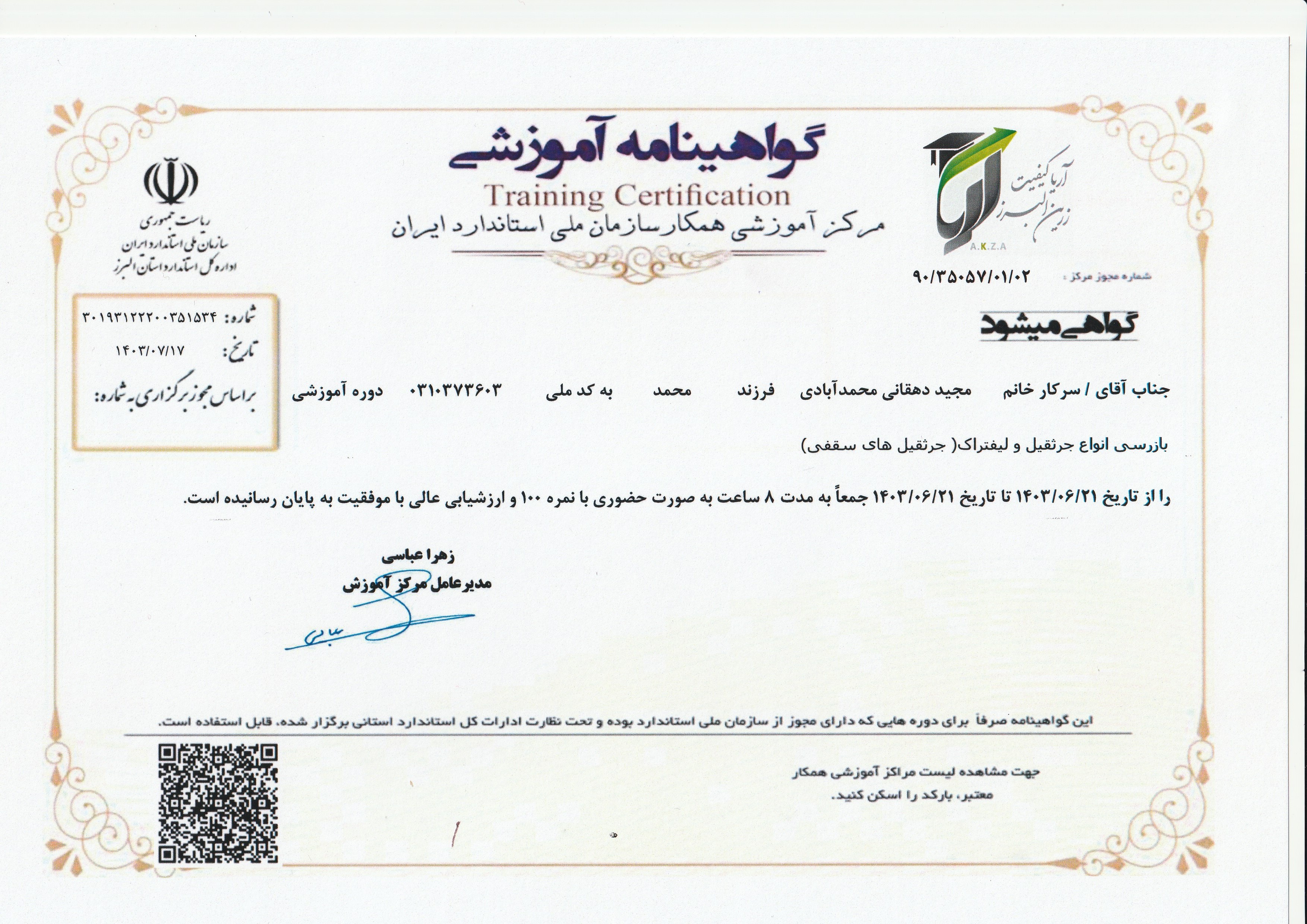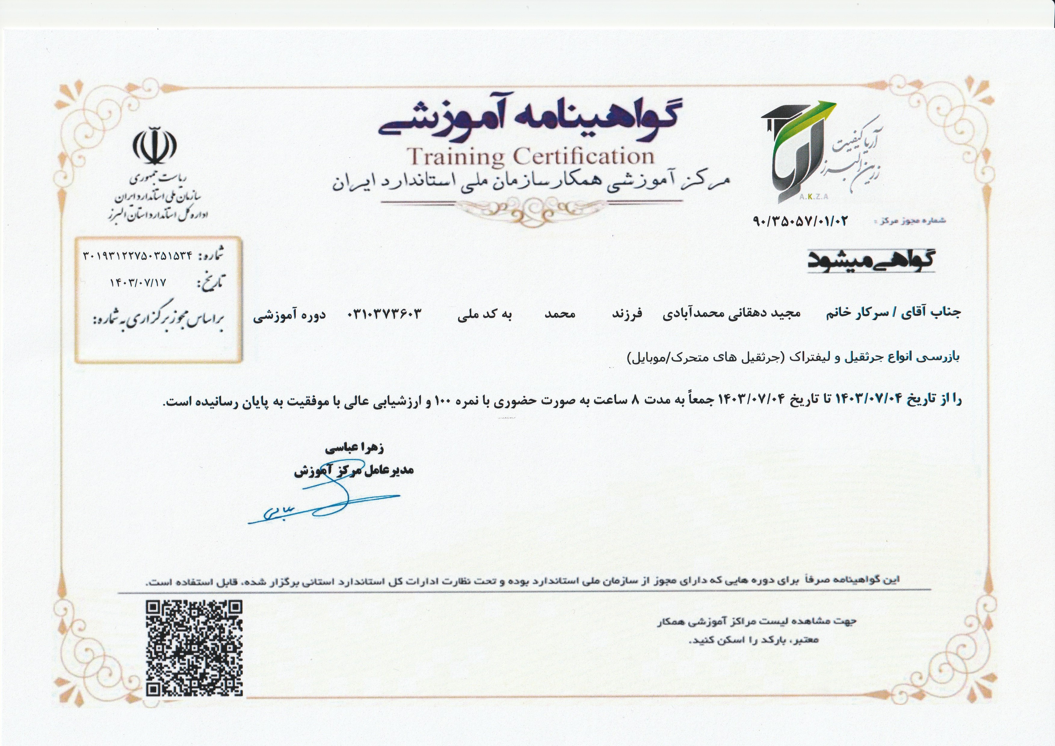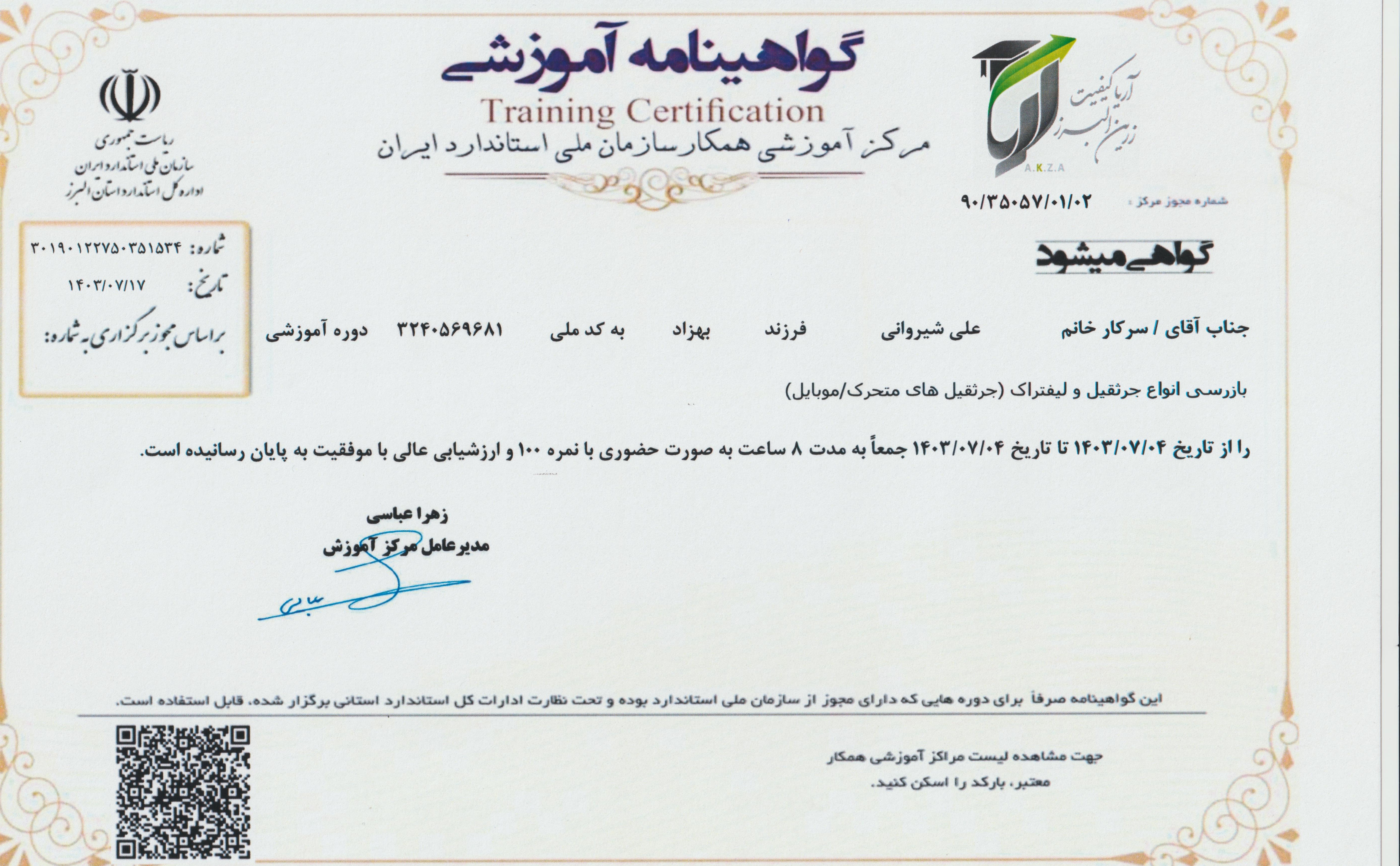 گواهینامه آموزشی جرثقیل سقفی سازمان استاندارد(علیرضاآقامیری)