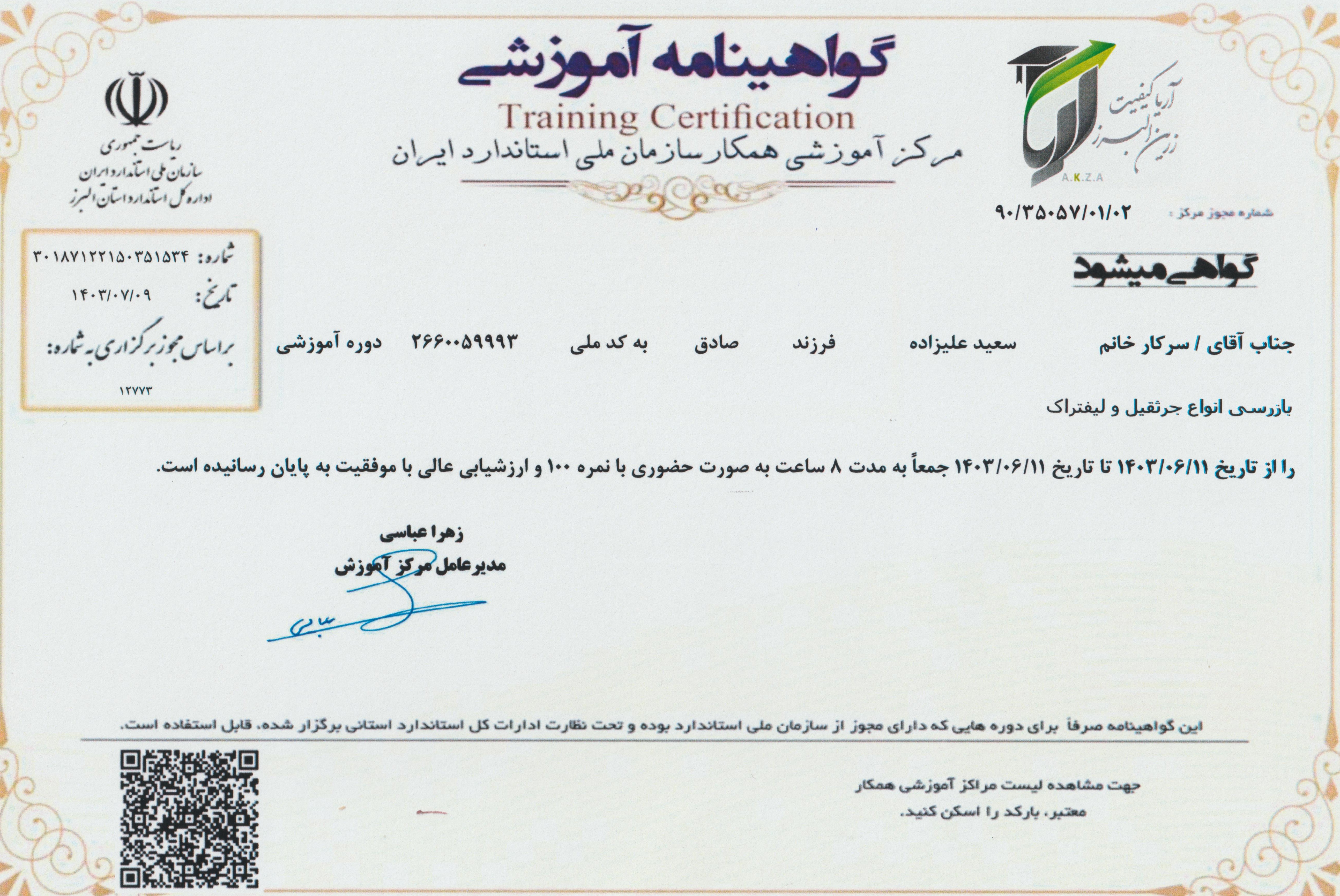 گواهینامه آموزشی جرثقیل سقفی سازمان استاندارد(سعید علیزاده)