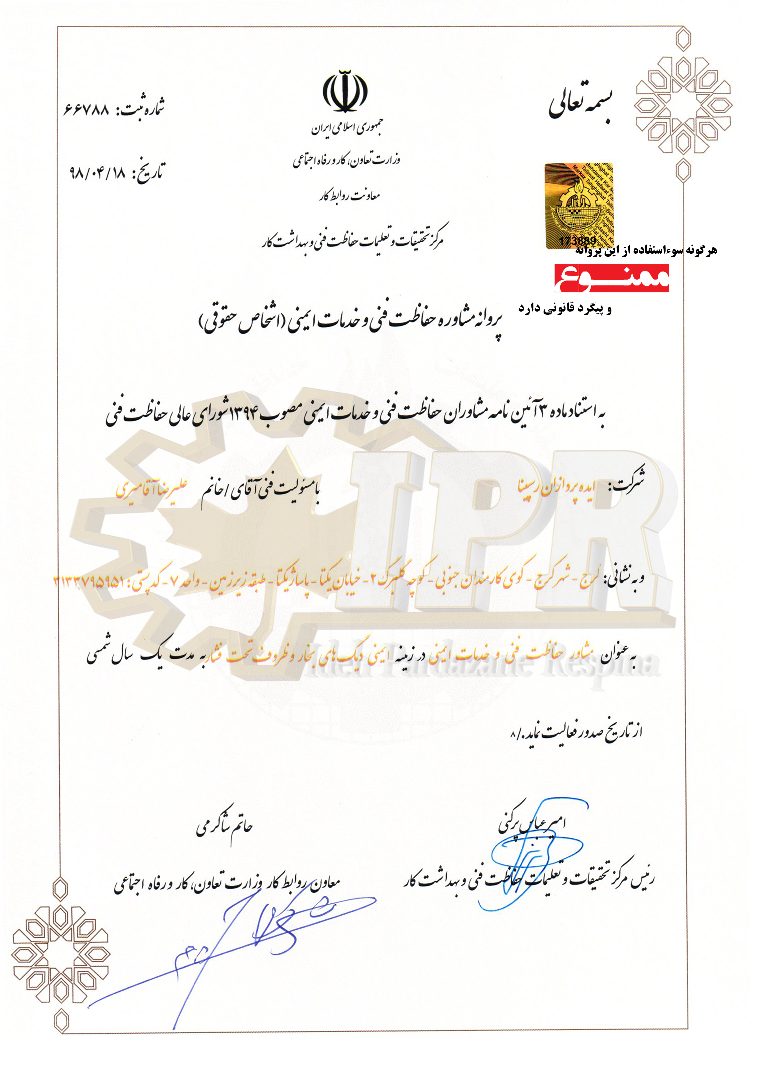 پروانه صلاحیت حقوقی ایمنی دیگ های بخار و ظروف تحت فشار